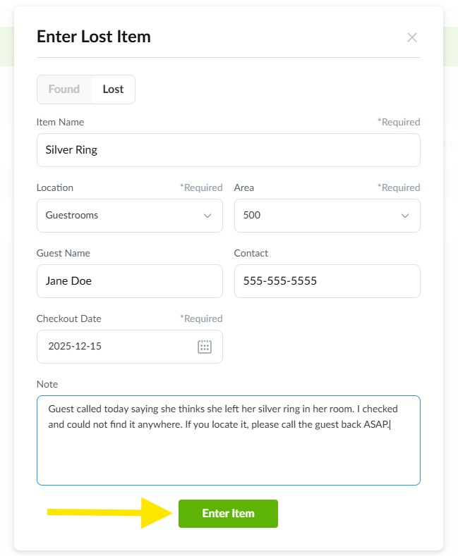 2. Select whether it is a Found or Lost item, then enter in all other fields. Enter in additional notes and click the green Enter Item button to post.