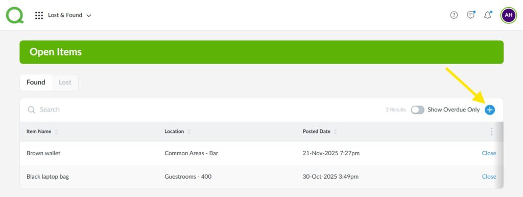1. From the desktop Lost & Found Open Items page, click on the blue + icon: