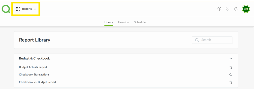 To access Budget reports, log in to the Quore desktop app and click on the Reports app from the App Switcher. From Reports, you will see Budget & Checkbook on the Library page. Click on the Budget & Checkbook row to view reports. Once you have clicked on the report you wish to view, you can filter and run the report.