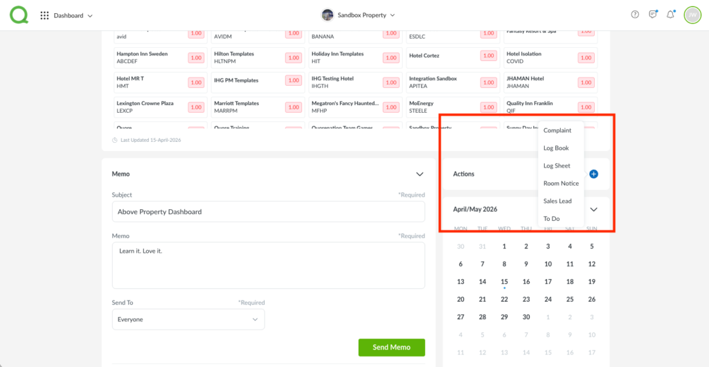 The Actions section offers several shortcuts that let you create log book entries, to dos, room notices, complaints, sales leads, and log sheets right from the Dashboard. Just click on any button to take action quickly and easily.