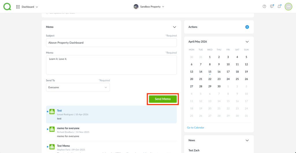The Memos section lets you send out reminders to everyone at your selected property, specific departments, or specific job positions.