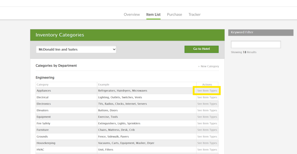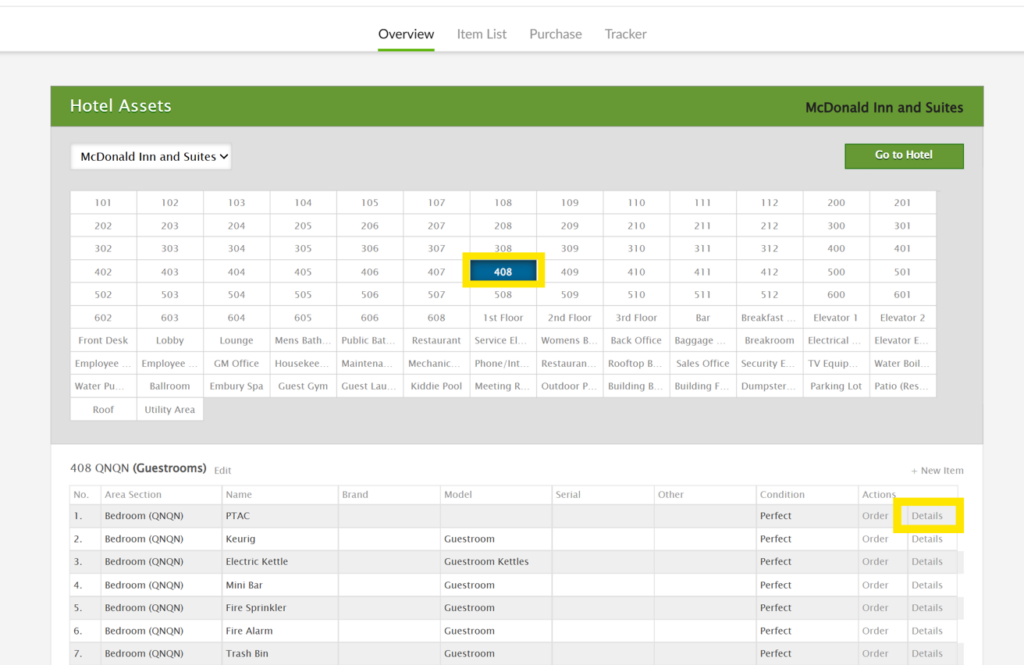 1. From the Overview page in the Inventory app, click on the area in the Hotel Assets grid where your item is housed.