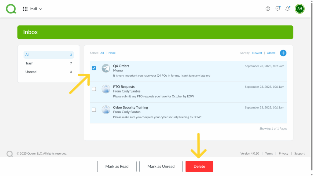 You can use both the desktop and mobile versions of the Mail app to view, create, reply to, and delete messages. Memos and important notifications will also be sent to your inbox. To keep your inbox organized, we recommend deleting messages that are no longer relevant.