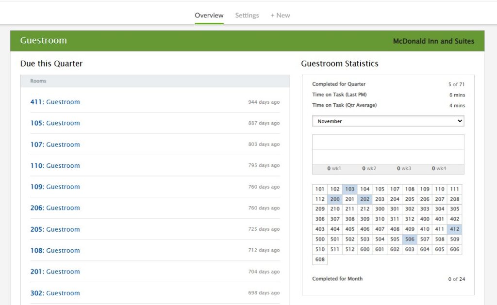2. If you click into a guestroom month, you will see a list of guestrooms to the left and a PMs rooms grid to the right. Light blue rooms in the PMs rooms grid indicate PMs completed sometime this quarter, while dark blue rooms indicate PMs completed within the month of the column you clicked into in the previous step.