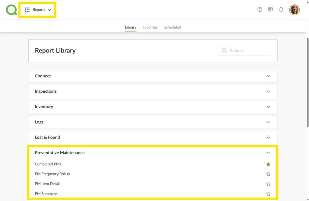 The Reports app offers four PM reports: Completed PMs, PM Frequency Rollup, PM Item Detail, and PM Summary Report. To access these reports, log in to Quore on the desktop and click on Reports from the App Switcher. Once in Reports, click on Preventative Maintenance from the Library page, then on the report you wish to view.