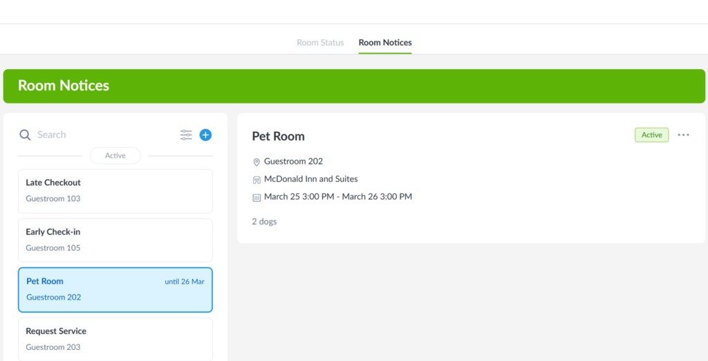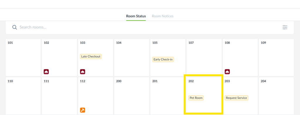 Pro Tip: You can also open a room notice from the Dashboard Rooms Grid by clicking on the guestroom number, which will be marked green when tied to an open room notice.