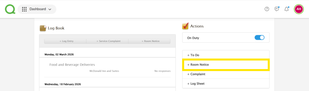 1. From the Dashboard, click the + Room Notice button in the Actions section on the right.