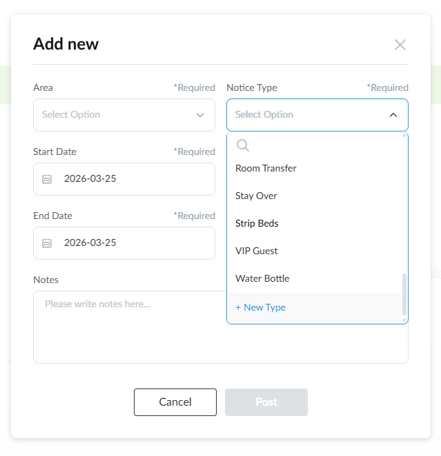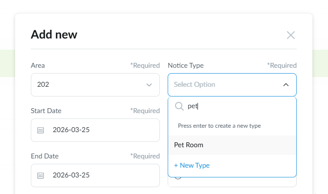 Pro Tip: Use the + New Type link to the right of the Notice dropdown to create a new notice type, but make sure you are creating a commonly used room notice type as you will not be able to delete the notice type once created.